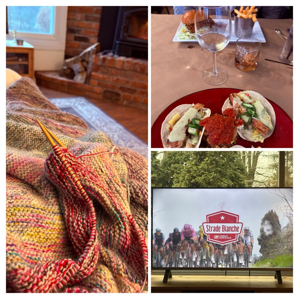 So Saturday morning was muggy and grumbled with thunderstorms, which was fine with us because we had firm plans to stay in and watch one of the opening events of the cycling season (we are cycling fans here), the Strade Bianche, where wunderkind Tadej Pogacar devastated the field, the same as he did last year (and as he probably will in every race he starts for this year). I tried to make some progress on the kiddo’s bug scarf but the double knitting requires significant brain power and when cycling is on all I can manage is the most mindless garter stitch. So I mostly worked on my Cozy Comfort throw which will be a blanket that the kiddo can take to college.