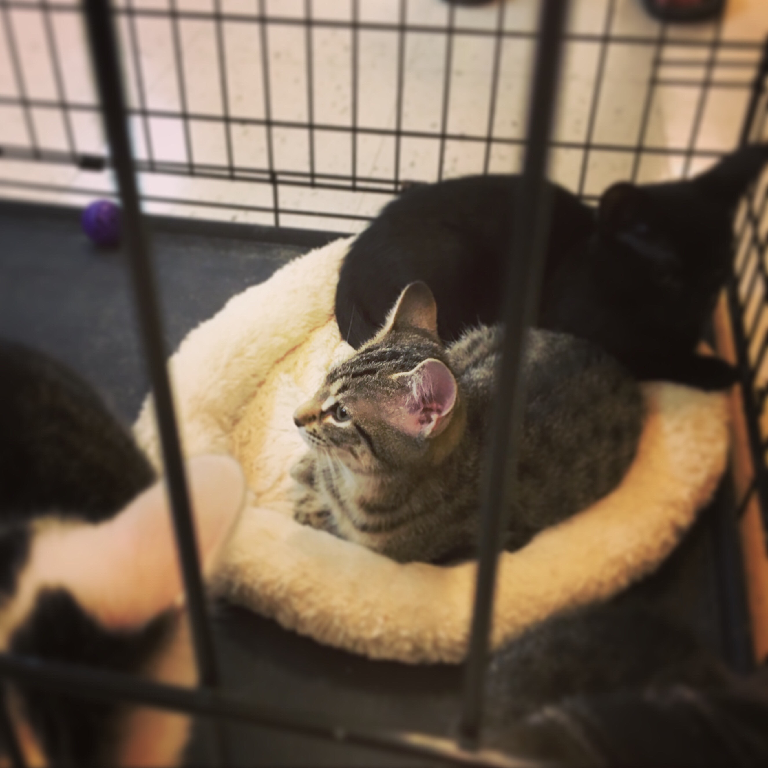 I wrote on Facebook that sometimes true love happens at the most inconvenient and unexpected times and this was true for Miss L. The minute she laid eyes on the tiny striped ball of fluff in the cage in the adoption room, she lost her heart irretrievably and that was that. I am a pushover and I love animals too and two hours (yes it really did take that long to fill out paperwork with some bighearted but organizationally and administratively challenged rescue ladies) later we walked out with Josephine.
