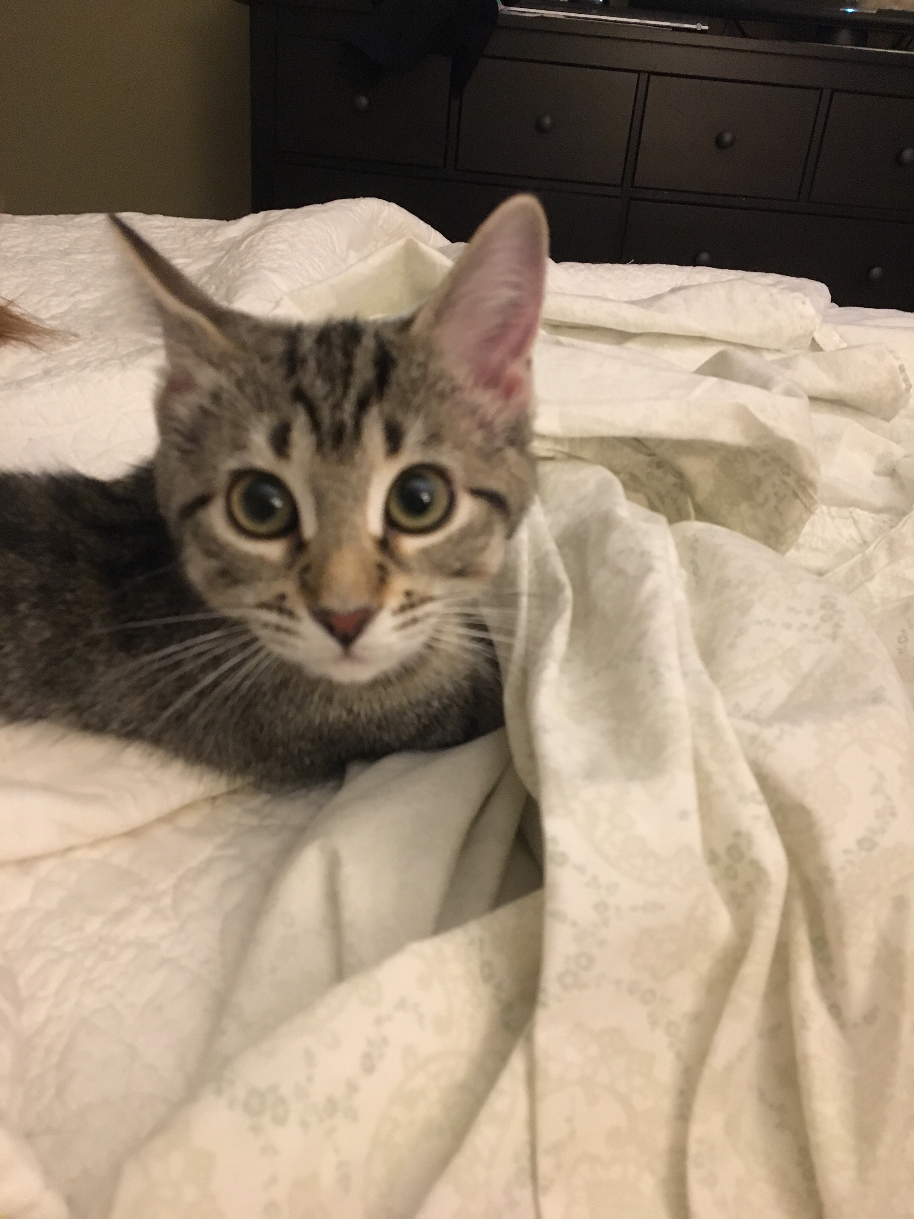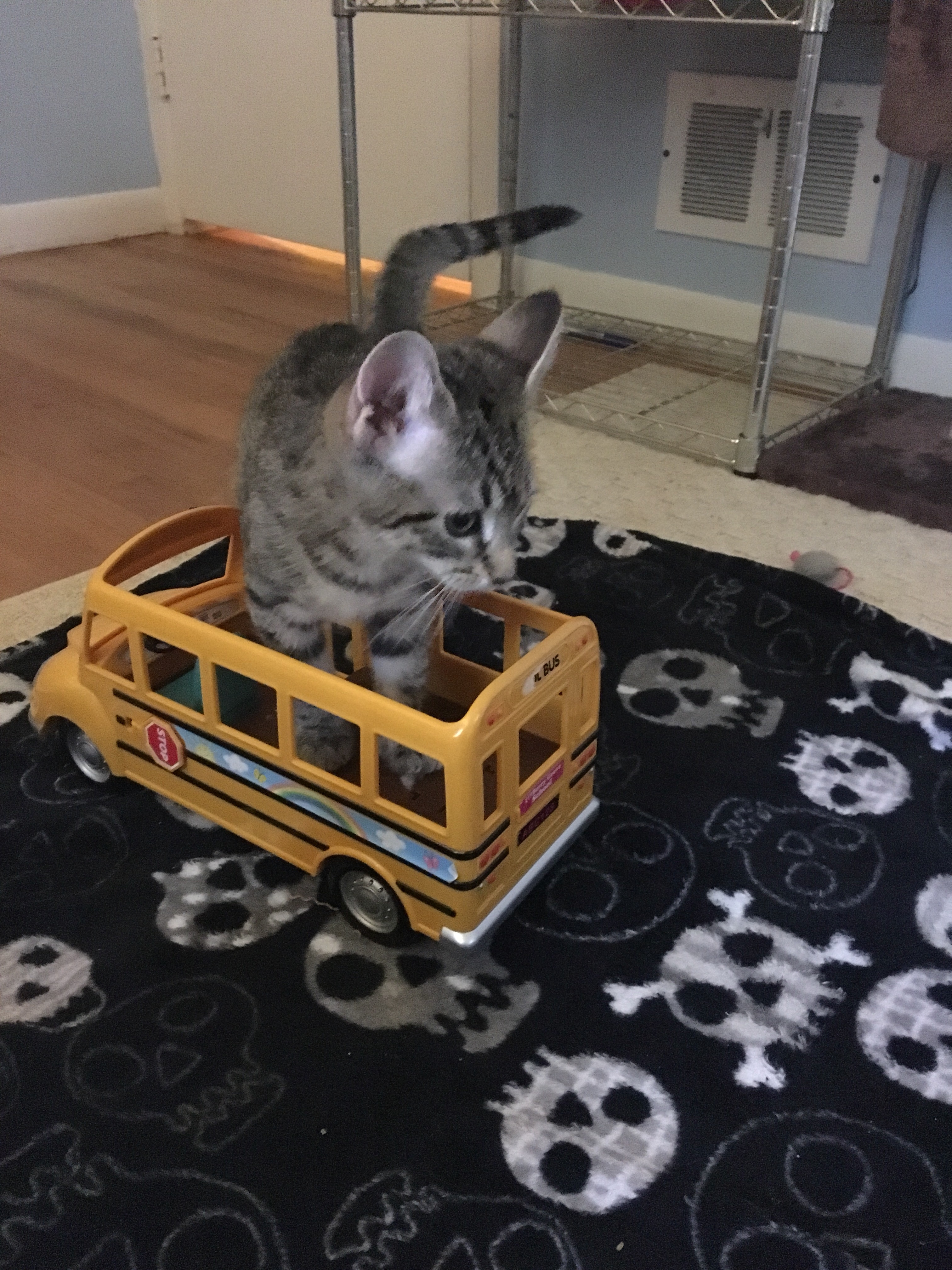 My cats are two big boys and they are not particularly nice even to each other sometimes. So we are taking the introduction period very slowly. We’re also relying on Jackson Galaxy to provide instruction. Josie has taken up residence in a spare bedroom that has morphed over the years from unused business room to unused playroom (and is really just a receptacle for stuff I don’t know what to do with). L and I did a psycho cleaning session to get it kitten-ready. She is an intrepid little thing and hates being locked away from the rest of us so we try to scent-swap,and let her explore rooms when the boys are elsewhere. We do feeding sessions together with the boys on one side of a pet gate and Josie on the other (the pet gate is not entirely effective unless she’s preoccupied with a bowl of kitten slop, though – she can squeeze through one slat that is just a teeeeeeny bit wider than the others). And we’ve done some play sessions, and the boys have generally been very good. There have been some hisses and growls, but not nearly what I expected – and when it happens, it’s sort of understandable as Josie is quick and tends to charge at the boys (tiny tail straight up) and try to rub against them and Sarge will have NONE OF THIS. I think it’s mostly just them figuring out their hierarchy and she has to learn manners and learn the pecking order, so I’m encouraged and pleased by their progress.