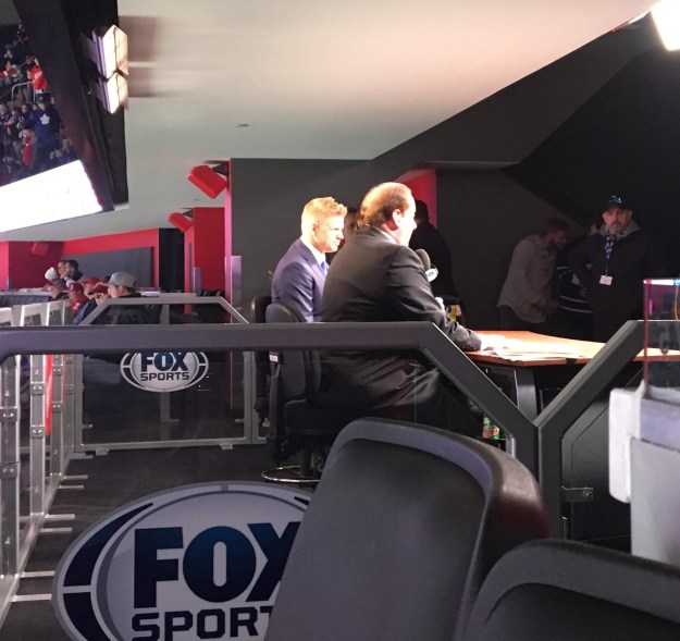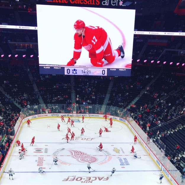 We went to see the Red Wings at home against the Maple Leafs last weekend…and sat right next to the Fox Sports broadcasting booth, which pleased Miss L to no end.