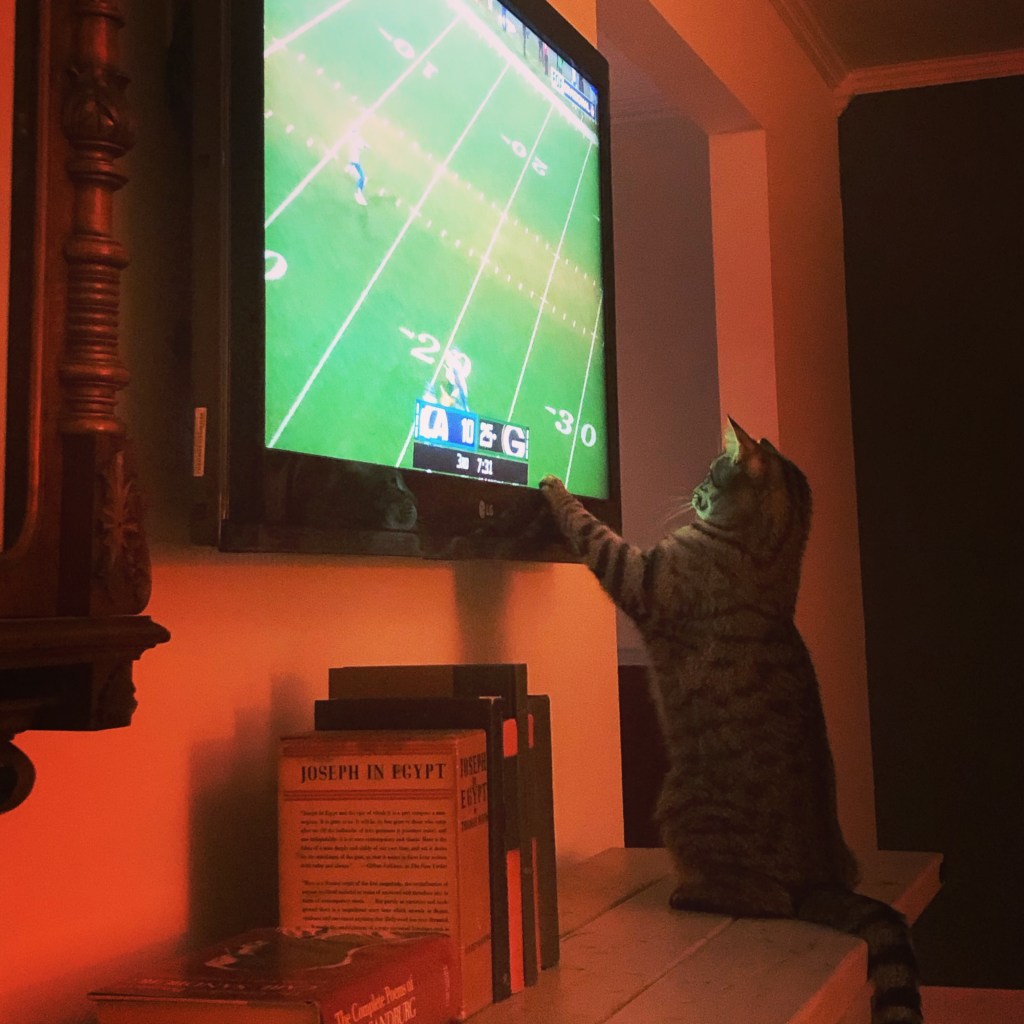5. Josie aka Pot Roast is by far the cleverest cat I’ve ever had. One day I pulled up a YouTube video on my computer monitor and let her chase a cartoon mouse across the screen for awhile. I called it “feline enrichment” a la the Kitten Lady (check her on IG). This was all cute fun and games until Pot Roast caught sight of the television monitor. Now she chases Green Bay Packers across the screen, punches out Audrey Hepburn during “Charade”, and thinks she can dunk a basketball like a Laker. Her particular faves, however, are Brandon’s old Kung fu films that he likes to watch before he falls asleep. The funniest thing is hearing a bit of a scuffle in a dark bedroom then seeing Pot Roast’s little ears and head rising up in silhouette against the television screen, looking like Tom Servo or Crow from MST3k. We don’t have the heart to discourage her but that will undoubtedly change when she knocks the TV off the wall and feels pleased that she finally bested Commander Wong.