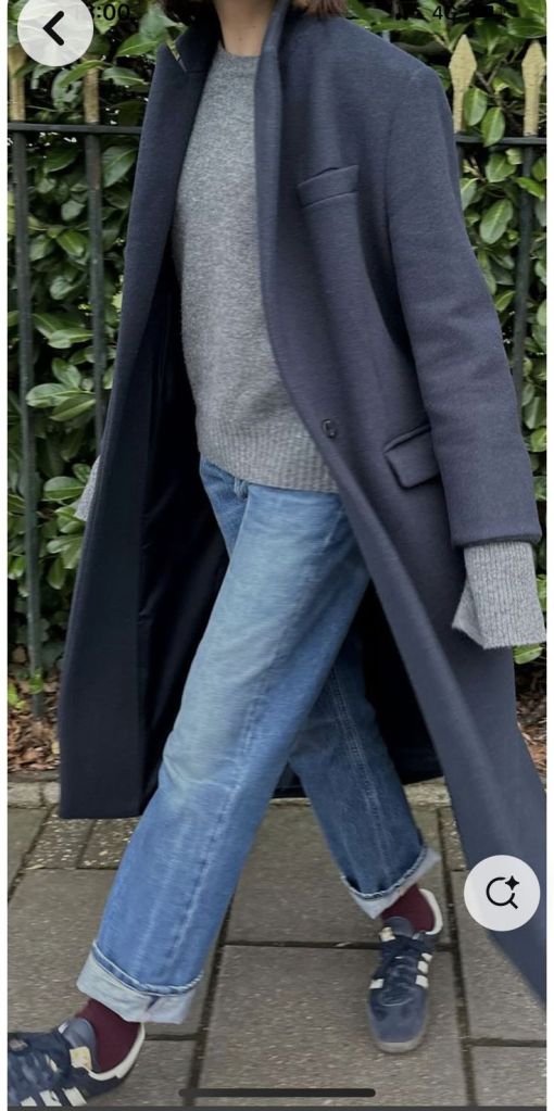 I love this look, especially the wool socks with the sneakers, and the wool coat. Funny aside – before the kiddo got sick we had a day out shopping and lunching in a posh suburb. She wore her dark blue Adidas sneakers and tried on my grey cashmere coat and I thought she looked very hip. She, however, shed the coat in disgust, proclaiming, “It looks like I’m wearing a BLAZER.” …kids.