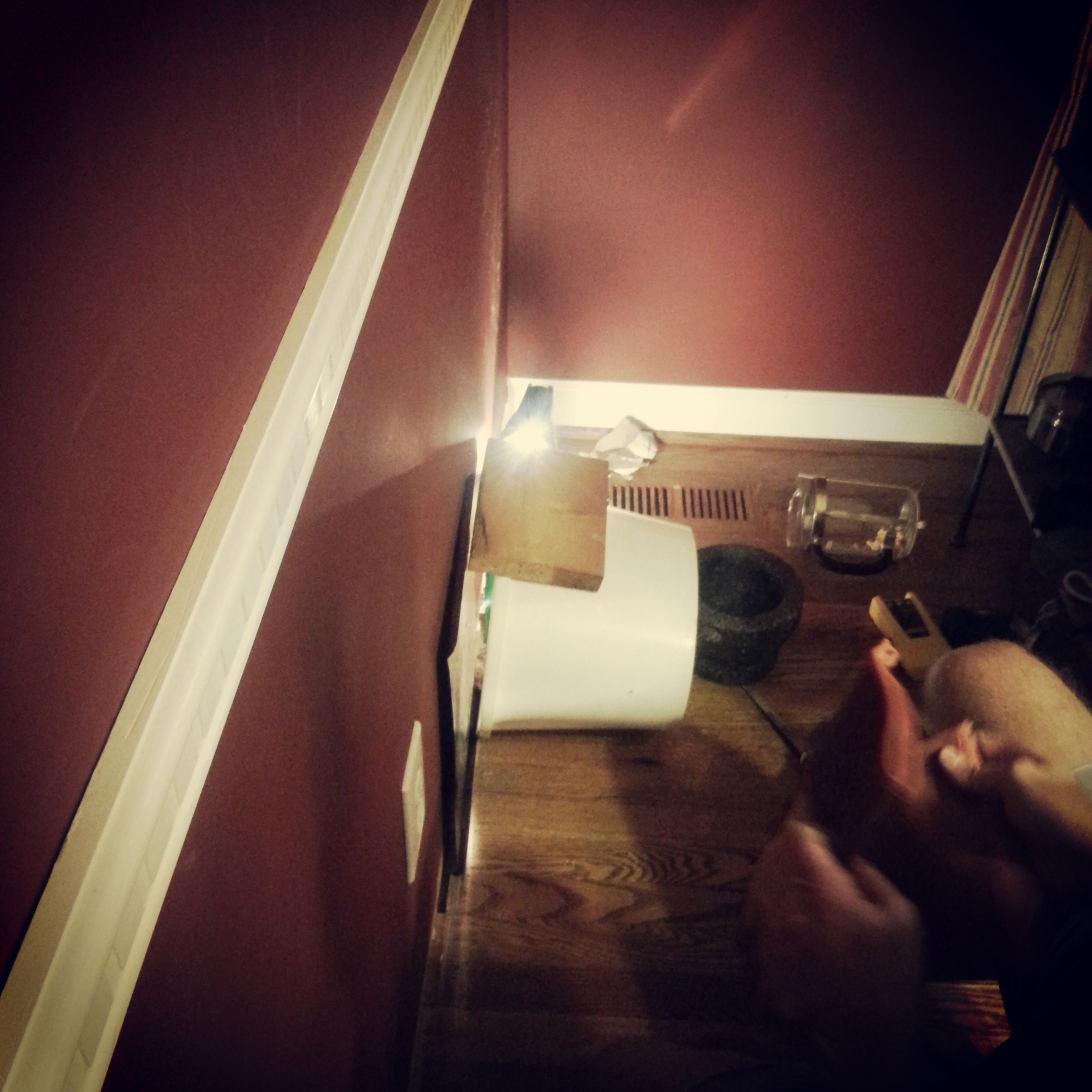 so last night, GB heard a loud scratching in the wall, and he informed me about it when i was sleepy and i promptly forgot. the situation apparently escalated quickly while i was stacking zzz’s. this morning, before i was even properly awake, he was standing in the bedroom door advising me that he was about to knock a hole in the dining room wall to release the scratchy thing.