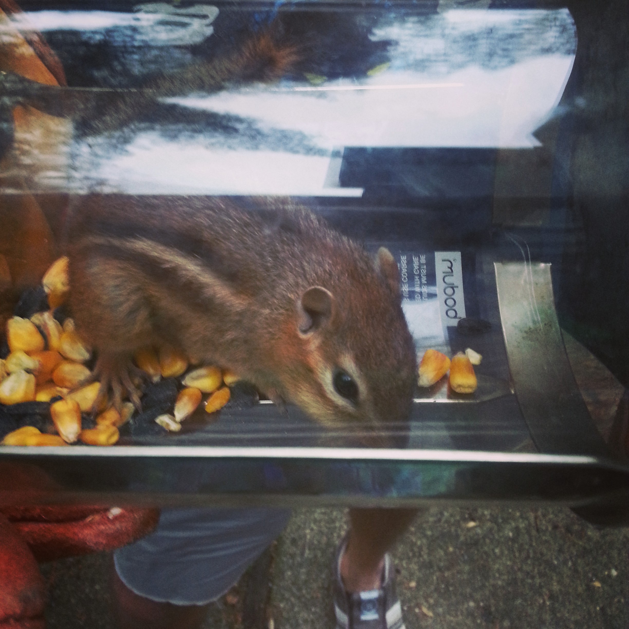 the beastie, which really did sound like a twenty pound raccoon or small bear inside the wall, nosed its way out very quickly, all things considered. behold; tiny little chipmunk. i recognized him from when i caught him sitting in the plastic bin of birdseed in the garage last week, stuffing his face. unfortunately, the intricate ‘cookie tin bucket’ trap that GB rigged had a tiny gap, and he went slipping out and zinging around the dining room before GB could catch him and clap the bucket down again. he transferred him to a jar with some cracked corn for a photo opp. the stupid piggish thing couldn’t stop eating the corn long enough to smile and wave at the camera. he was released into his natural habitat and promptly returned to hang out for awhile underneath the birdfeeder.