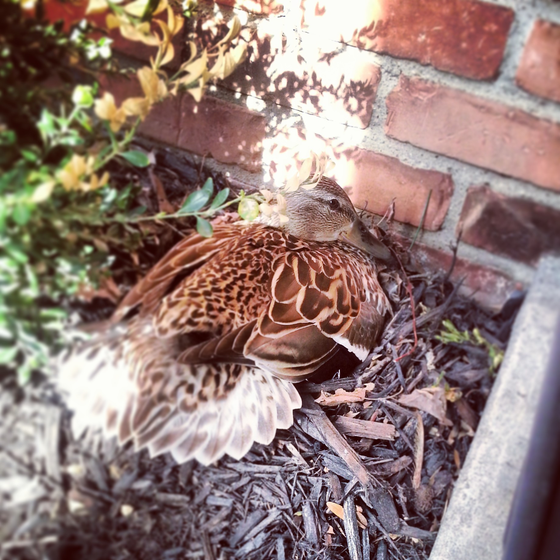mommy duck (apologies for our lack of cleverness in naming) arrived on mother’s day. i was in the front yard when she and her husband (or boyfriend, who am i to judge) made a flopsy near-crash landing. her partner waddled across the street and stood in the shade of a flowering tree, looking annoyed, and she huddled at the foot of our birdbath for awhile. later, when i went out to continue unpacking the car from that weekend’s journeys, she had taken up residence in a corner of our garden behind a bush, quite near to the front door. she has since laid six eggs, and every day the nest is banked up a bit more, a neat mound of mulch and soft pinfeathers. i worried for awhile about her eating, and tried to leave her some food, but bread isn’t a good alternative for ducks, contrary to popular myth, and she ignored the millet. the red squirrels and chipmunks stole her cracked corn, and brought out her tail-fanning-hissing mode, so i have had to be content with leaving her a dish of water which she may or may not be partaking in.