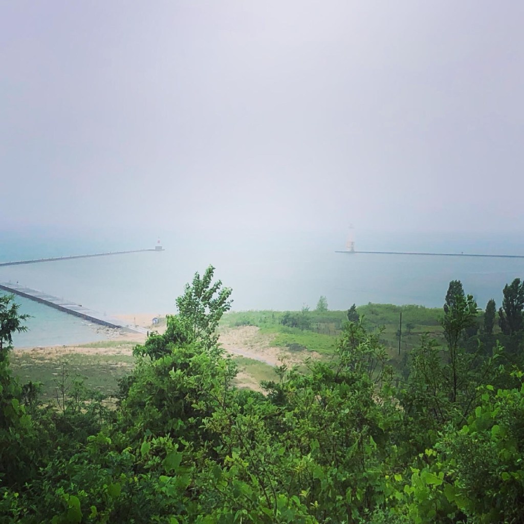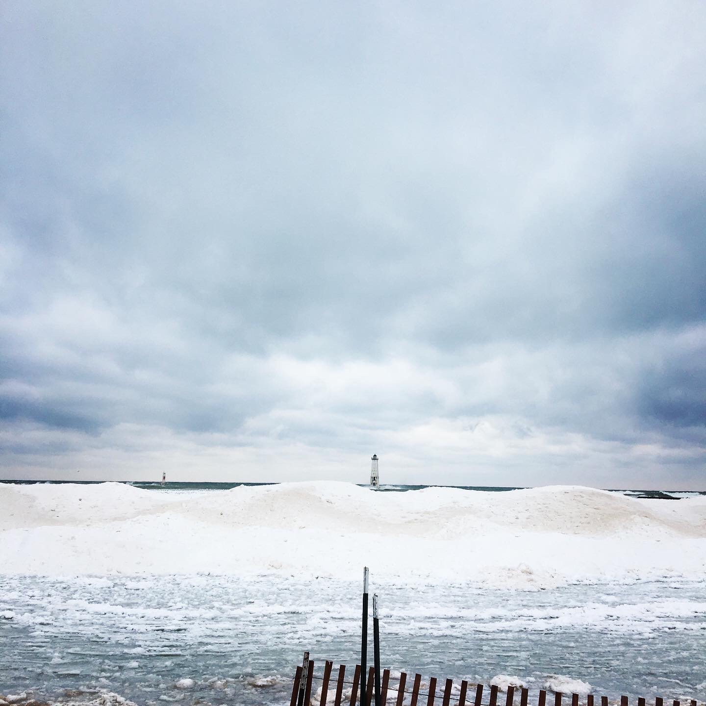 We then drove 2 hours further north, to the village of Walloon Lake, which is most famous for being young Hemingway’s Michigan playground. We found a historical marker, and there’s a statue of him somewhere around, but the wind was blowing fine snow into whiteout conditions everywhere so we gave up looking. Instead, we skied at Boyne Mountain (the kid snowboarded) and enjoyed our perfect little Vrbo. As we get older, my ability to stay in a hotel has decreased significantly. I hate being cheek to jowl with mass humanity, having to either pay for every meal and snack or rely on hotel coffee and crumpled snack bags. Give me an AirBnB or a Vrbo every time. I know they’re wreaking havoc on small communities but selfishly I want exactly what we had this weekend. Which was a cozy cottage on a private lot with a fireplace, hot tub, separate bedrooms for us and the kid, a beautiful living space and kitchen, fully appointed. We cooked, we had good coffee, we had a fire, we watched movies, read books, I knitted, and we had privacy. I threw caution to the wind and ate what I wanted to eat, drank Horny Monk from the Petoskey Brewing Company, and made a fool out of myself on the slopes. (I fell. A lot.) The snow was almost claustrophobic – piled higher than street signs and just continually sifting down. The drifts outside the Vrbo were up to the windows with paths cut into them to access doors and the driveway – if you don’t have a snowplow or a snowblower running constantly, you would have big trouble.